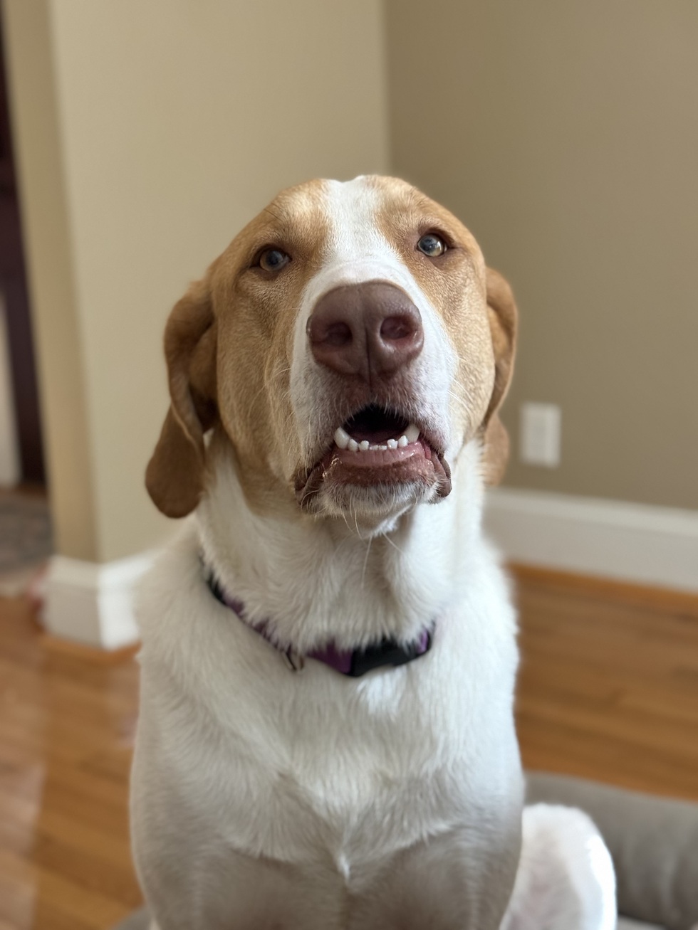 She is our 1 yr old rescue pup from North Meck Animal Rescue. Constantly eating things she’s not supposed to and ending up at the vet to get her stomach pumped. She’s a mess, but our mess and we love her! Enjoy her big goobery face.