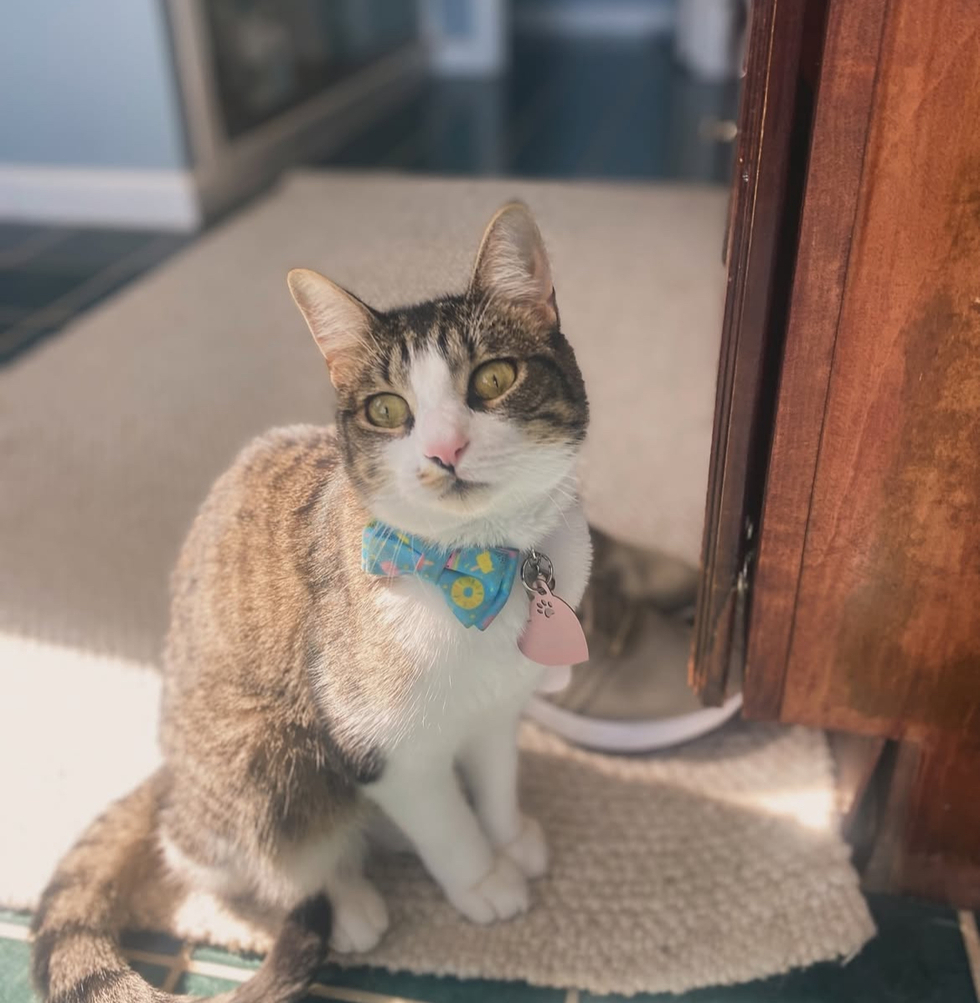 Chicken is funny and she has a lot of energy but she likes to cuddle with me when she is not running around . She likes to go outside to play she has a next door neighbor cat that she is friends with