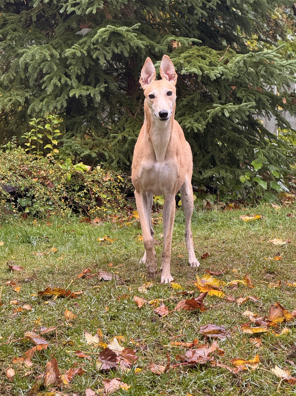 Lyra is a 4 year old Spanish Greyhound. in 2024 Lyra was rescued in Spain she was quiet and shy. Through the help of Greyhound pets NL she was brought to Canada in 2024 and successfully found her home in April 2025. Lyra was welcomed into our home with open arms however she was still very shy and nervous, a year later Lyra is now a spunky playful girl who loves stealing chicken and cheese from every surface. Lyra often spends her days running in the back yard chasing squirrels or asleep next to the heater dreaming about chasing rabbits.