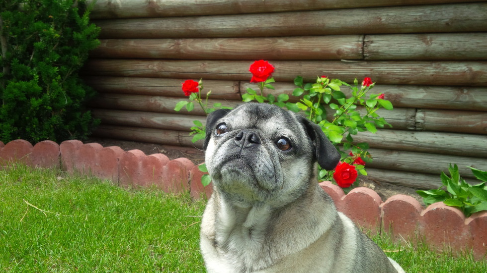 Rosebud is a ham, never one to miss a photo op. Hug-a-Mug-o-Pug 🍺