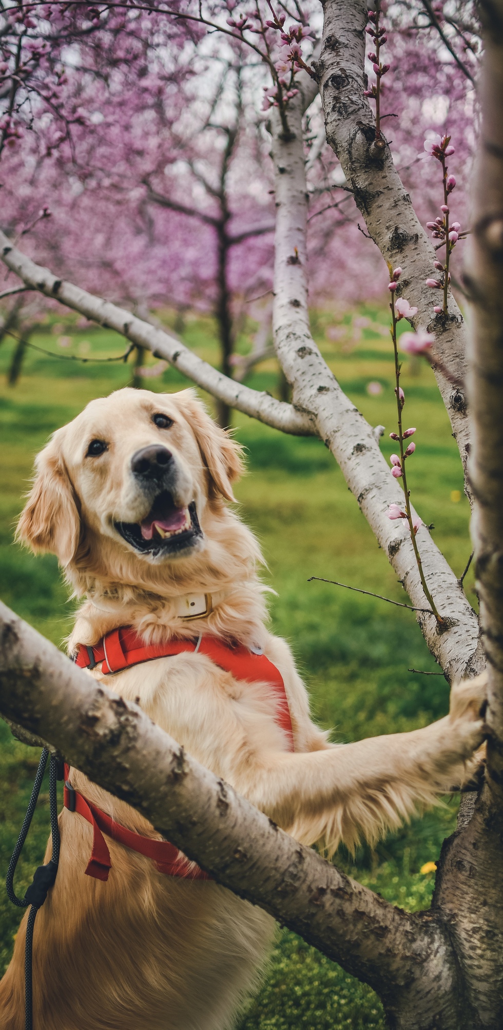 The blossoms feel like the perfect backdrop for him. There’s something about spring here… fresh, hopeful, a little whimsical, that matches his goofy sweetness. Arthur is playful but calm, curious but grounded. In this photo, he looks like he belongs exactly where he is, surrounded by colour and warmth.