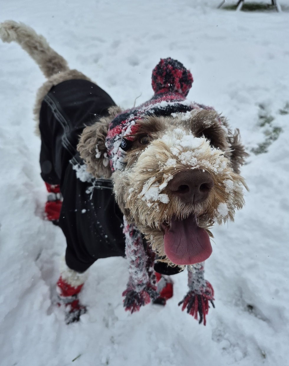 Oscar is a special dog with human abilities and connection with his person and asks for nothing in return but some fun when the working vest comes off. Oscar enjoying the snow in his styling gear is a hoot to see , stuffing his head in drifts of snow and plowing!