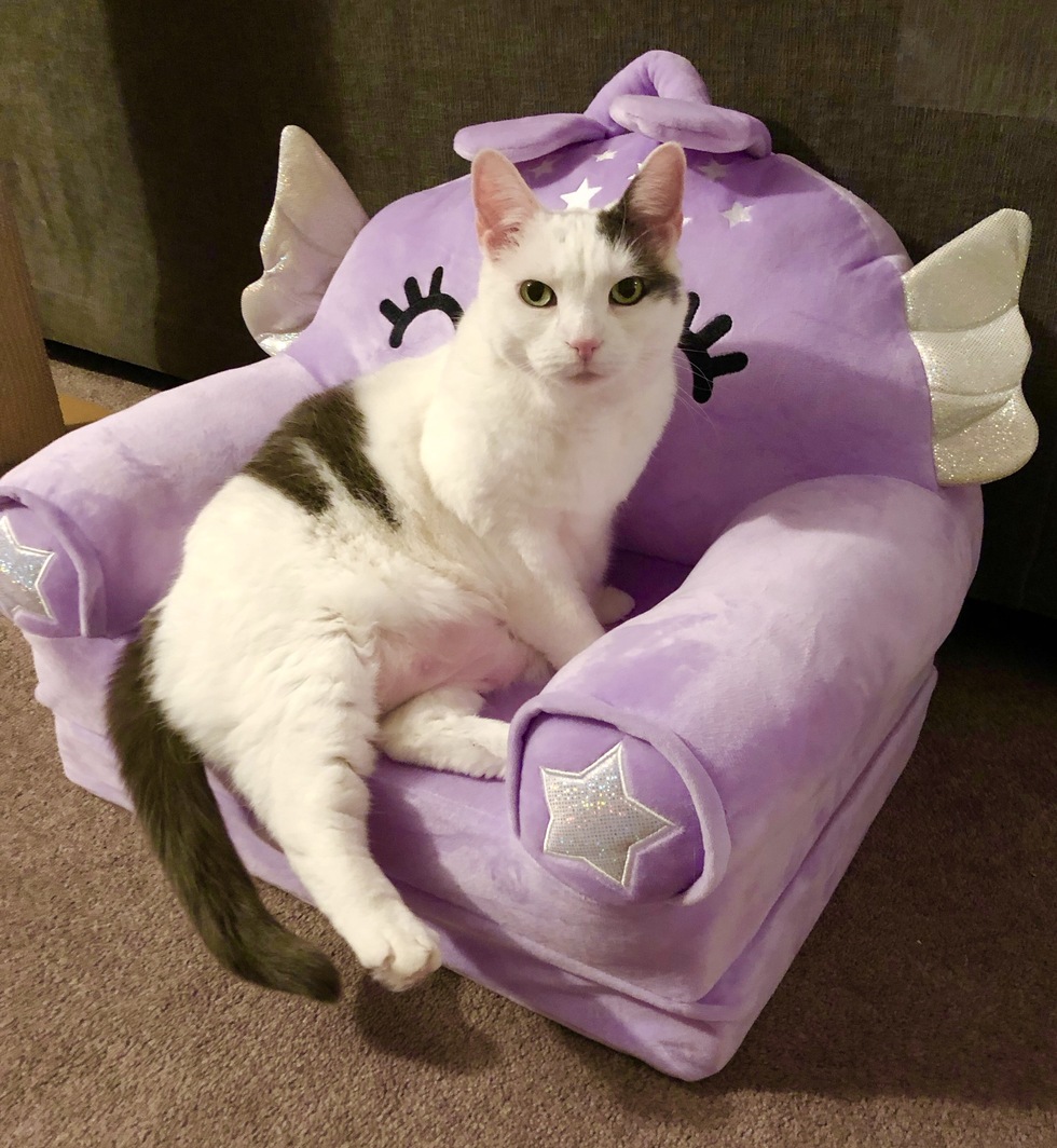 Always tolerant, she puts up with her mom aggressively cuddling her and her human cousin’s tea parties. She loves the attention; in fact, you can get her purring just by looking at her!
