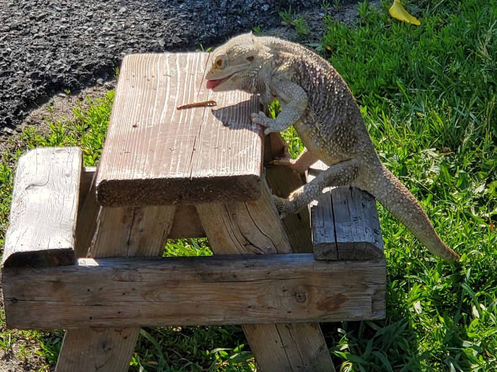 Because he is awesome and eats at a picnic table.