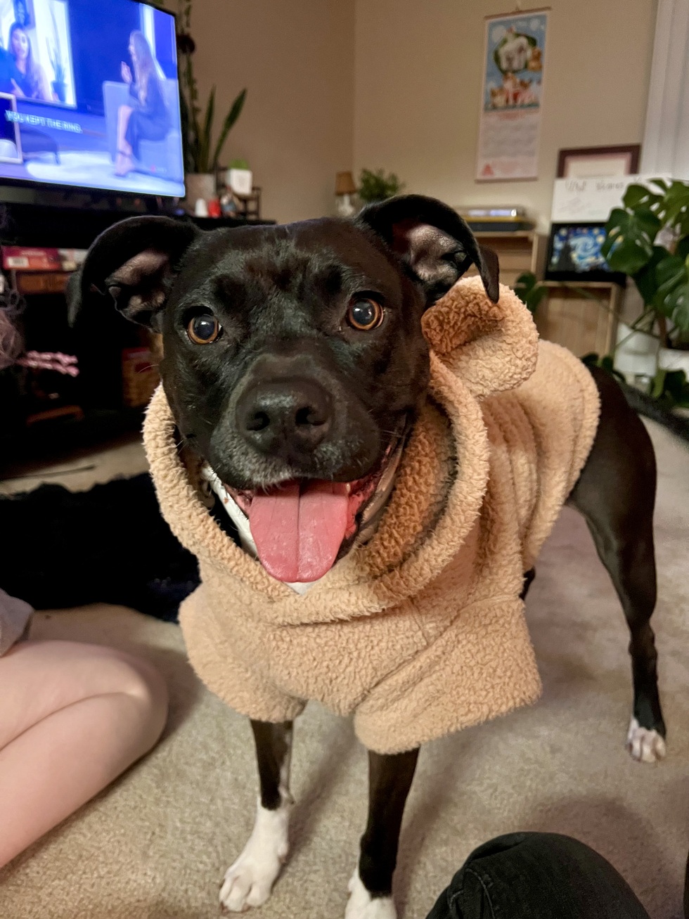 She was first found roaming the streets of rural Ohio and was then adopted by a girl in her 20s who refers to kora as her daughter. She is a staffy-pitbull-boxer mix, and her greatest features are her smile, her ears and her socks.