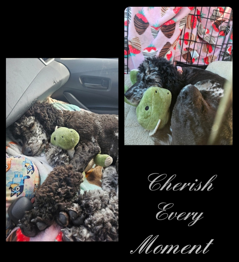Cuddling, either me, or her favorite toy.