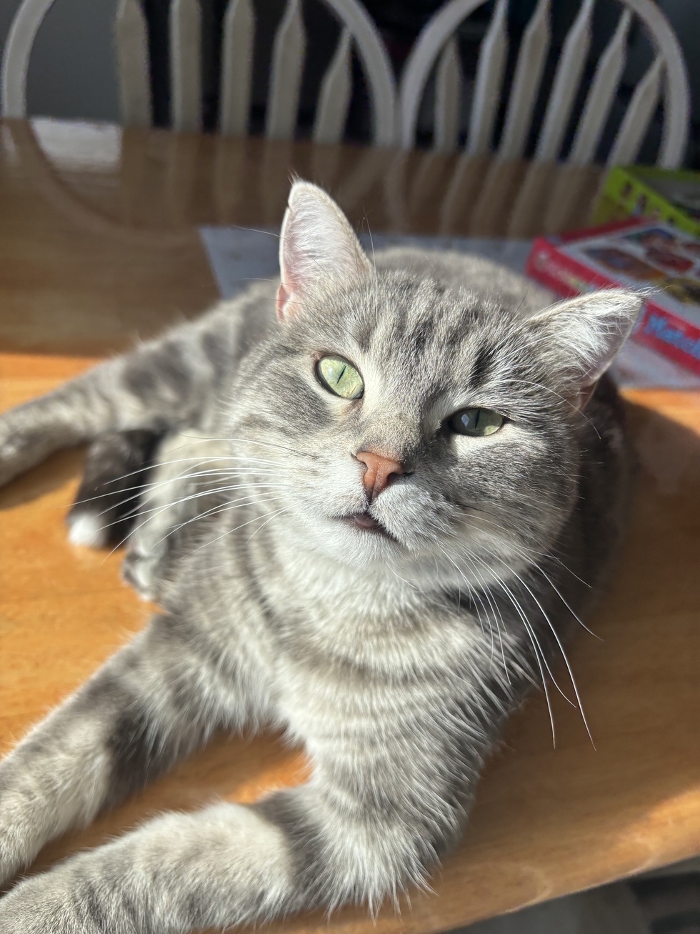 Pennie is a 4 year old grey tabby. She’s full of energy despite her cuteness she’s as spunky as spunky can get. She loved belly rubs. Fun fact: this girl before we adopted her had 13 kittens!!