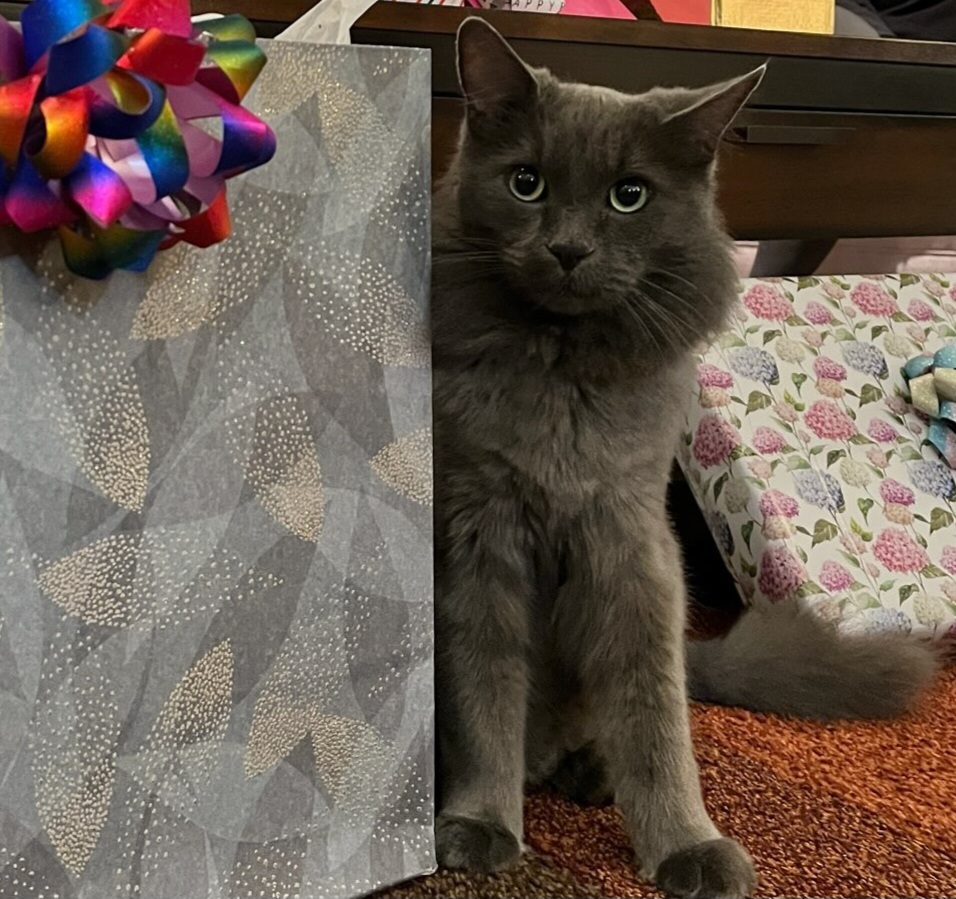 Goose is so adorable he doesn't know he is a cat. The sweetest, cuddliest, most friendly and playful cat you could imagine. He will be 14 years old in October 2026. In this photo he was patiently waiting for ribbons to play with.