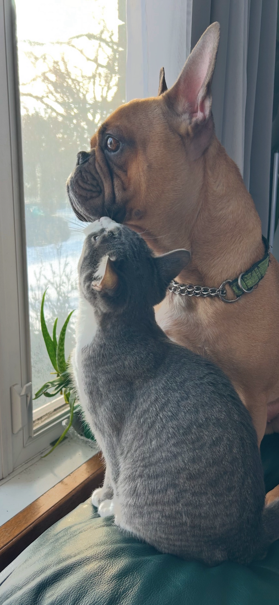 "Best friends" Cash is a 5 yr.old French Bull dog and Johnny is a 1 yr old short hair domestic cat, a rescue from the humane society.