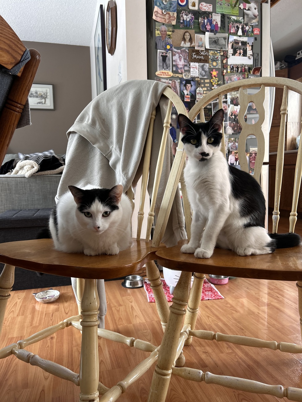 In 2021 we adopted Jersey from the Humane Society. She did and still does love her chin scritches! In 2024 we adopted Gouda from Wpg Pet Rescue and boy is she ever quirky! She’s a very playful girl especially with Jersey and loves her naps in the linen closet!