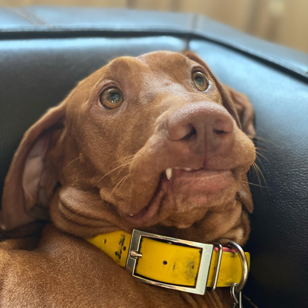 Meli, aka Smelly Meli, came to join our family shortly after we lost our very loved vizsla, Mya. Meli loves to sploot, take long walks next to the lake, be crazy with her siblings, make appearances on video calls and be the biggest velcro dog ever. She is full of sass yet has the biggest heart ever! I mean just look at that face! How could you not love it?!?