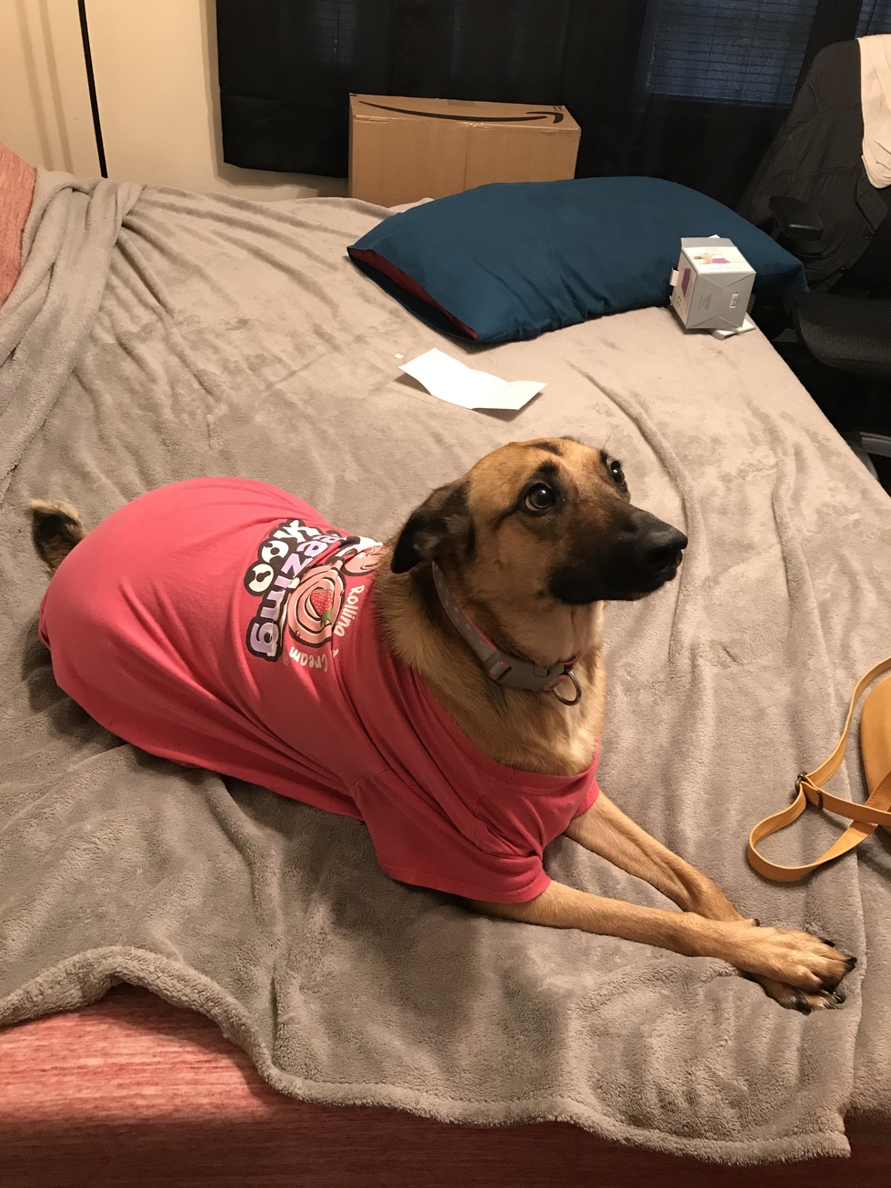 This is Rubi and she is a 3 year old German Shepard mix! She has a natural nubbed tail, giving her the nickname “Nubbin” and works hard rolling ice cream all day long. She loves people and running at the dog park but, especially loves watching tv.