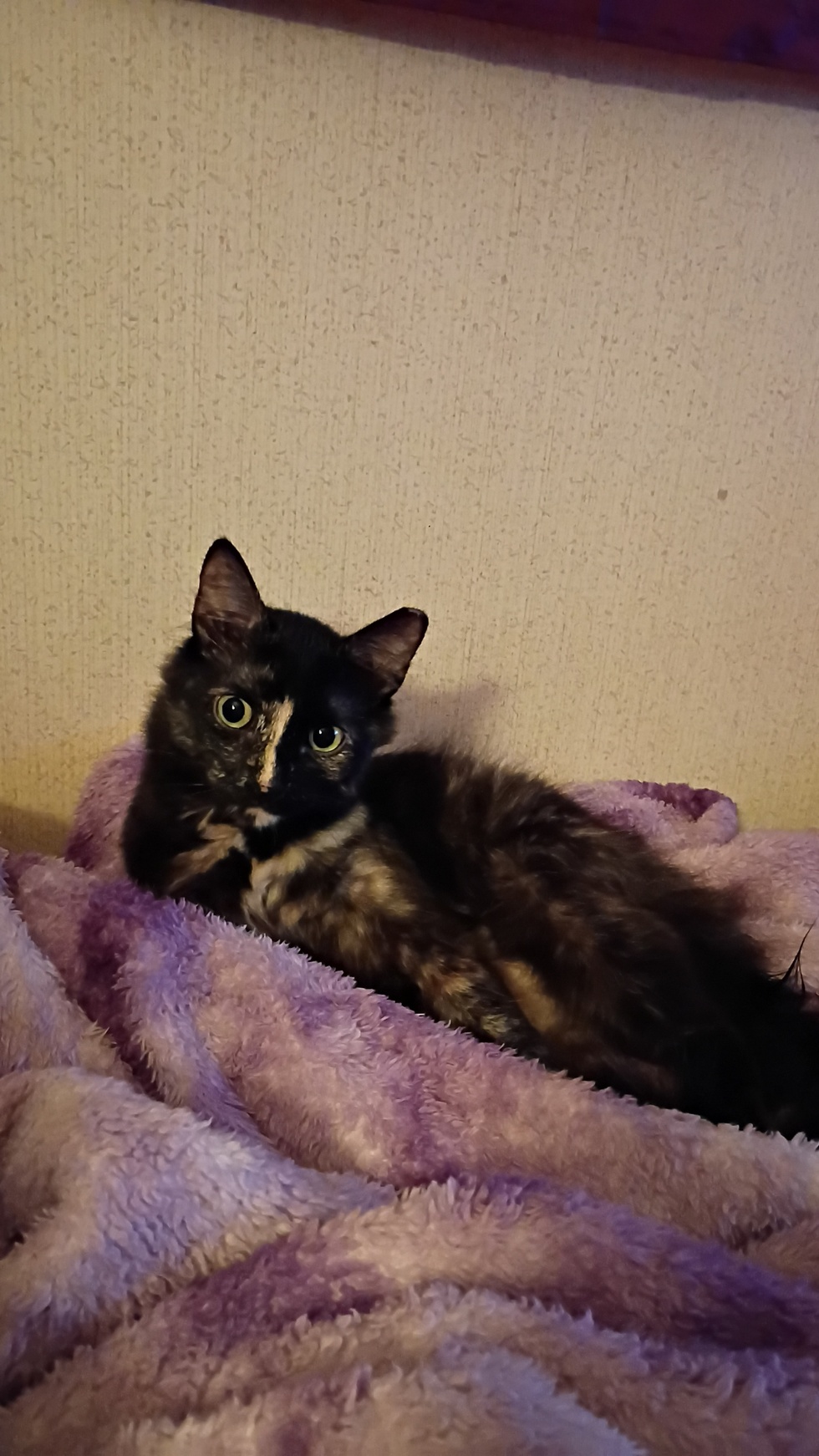 This is Aurora she was a feral wild cat when I first ever saw her she was about the size or my hand her momma brought her to my house because I set out food to feed the strays. I watched Aurora grow over the winter and now she is a mama she had her first litter of babies on June 2nd 2025 ( she's been fixed) I took her and her babies in to keep the safe. She was very feral and wild and wouldn't let you near her but I worked with her and finally tamed her and now she's like putty in my hands. She can still be mean but she's got a great personality and brings joy to my heart.