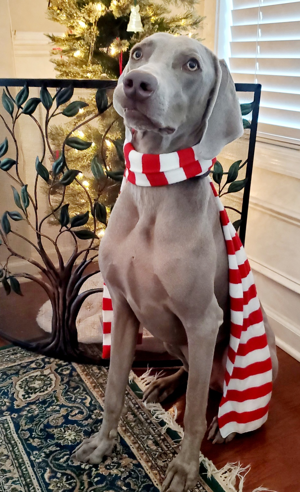 Meet Carter—a dashing Weimaraner who joined our family through Weimaraner Rescue of the South September 2024 and quickly made himself at home. This photo captures his first Christmas with us, looking angelic just hours before he decided he was deeply dissatisfied with my holiday tree décor… and erradicated all the ornaments so I could try again.