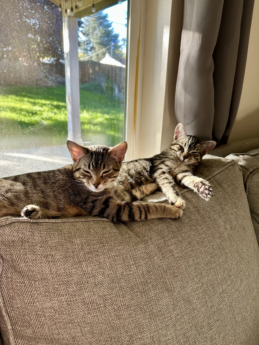 Syrah and Nugget are sisters. When we met Syrah and Nugget, they were so bonded we knew we couldn’t break them up. We are so happy we made that choice. We decided to name them after a wine grape variety (Syrah) and a hop variety (Nugget). They are sweet and snuggly but can be quite spicy leading to their nicknames Spicy Nugget and Siracha.